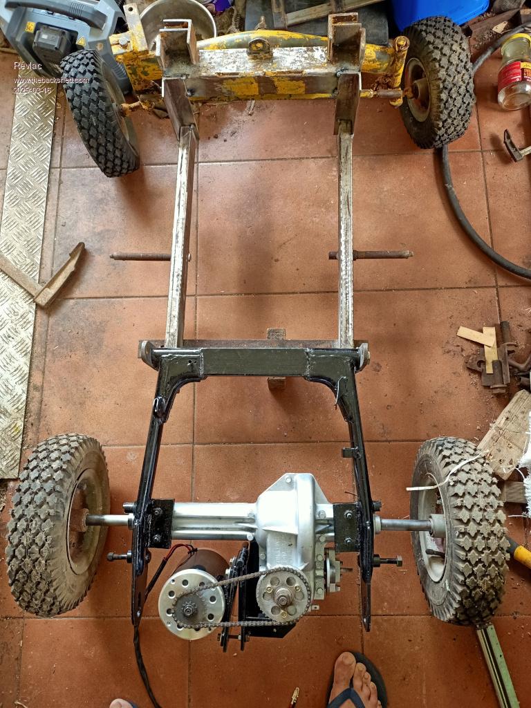 Some frame rails mounted onto the rear swing arm, the front end is off an old Rover Rancher lawn mower, We had this one since the early 1980's