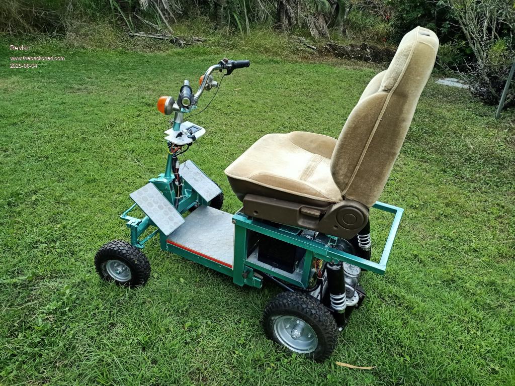 Its not fast, just gets up to a brisk walking speed which is fine for around the yard, tried it going up the driveway (its reasonably steep at the front of the carport) and with some effort one could manage to give it all the throttle it had (leaned back) and managed to get the front wheels off the ground momentarily, no Chance of it going arse over... on this driveway, if it was going to be used in steeper places then I would consider putting a safety bar or wheel at the back. It will need a hand brake as is can free run down the driveway, no way to stop, there are a still a few things to do mostly cosmetic stuff, cover the battery compartment and lights etc, but at least its a runner.