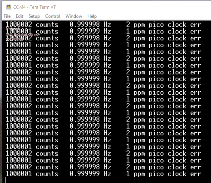 The program measures the period (in microseconds) of both clock signals and shows the ratio in ppm (parts per million). The program uses the PIO to measure the period.