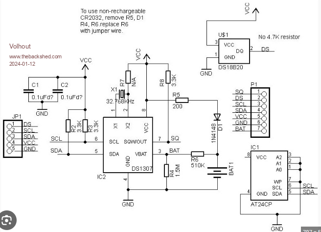 The circuit is the same as in Volhout's post. It has a charging diode and resistor yet is fitted with a non-rechargeable 3V CR2032 cell. This didn't matter when powered from 3.3V. The 200Ī© resistor has now been removed.