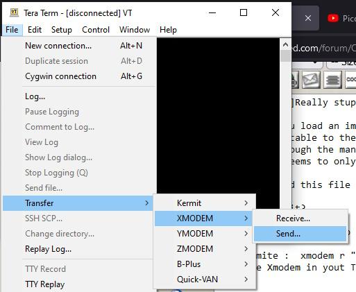 The PicoMite has a file system in flash (size 688KB), so you don't need an SD card unless you have more files than will fit. XMODEM R "filename.jpg" works within teraterm. But if you're familiar with MMEdit, it may be easier for you to use that PicoMite, Armmite F4, SensorKits, MMBasic Hardware, Games, etc. on FOTS |