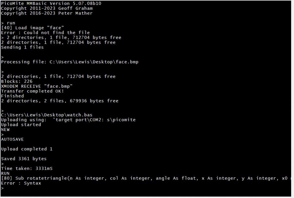 Type on on Picomite : xmodem r "face.bmp" then use Xmodem in your Terminal Program (for example TeraTerm) and send the File.. ![]() Firmware should be PicoMite MMBasic Version 5.07.07 or higher. There the Flash is Drive A: So you have a filesystem without SD Cars Edited 2023-08-05 03:58 by Martin H. 'no comment |