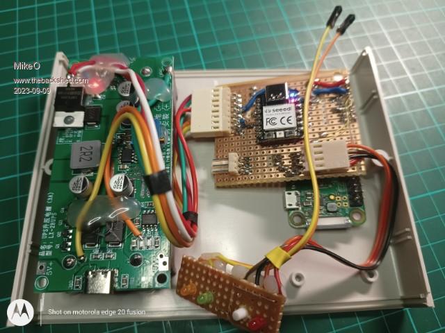 UPS made a bit smarter by the addition of picomite. The 5volt output is switched with the addition of a High side P channel mosfet . Charged output from 4056 and UPS power input are both monitored so UPS run time on batteries can be managed. Status Led and Soft Power switch allow Startup and Shutdown (and power off) of the attached Raspberry Pi.Just printing mounting hardware for the case but here is parts sitting roughly in position. Pi Zero is sitting under the perf board. ![]() Codenquilts |