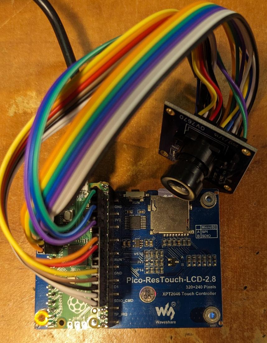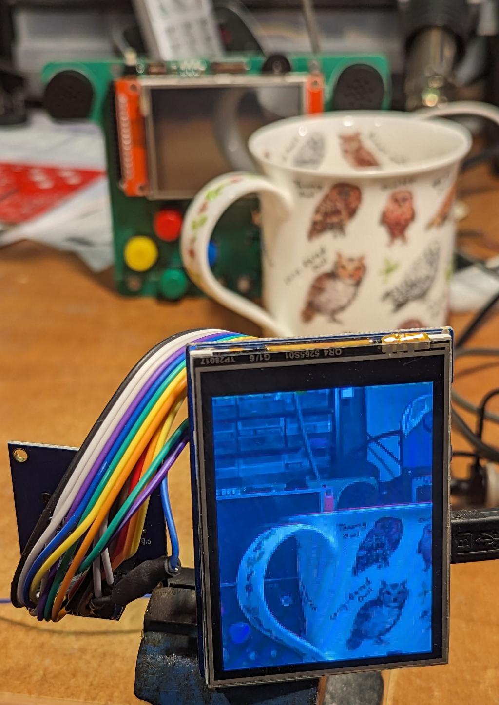 This uses the cheapest version of the OV7670 camera e.g. and captures a 160x120 RGB565 image which it then writes to the screen. The colour rendition is tolerable (much better than it appears in the photo) but could be improved further by tuning the various camera registers. Update rate is 7FPS onto the display at 1:1 scale and 5FPS scaled to 320x240. The camera is set up using an I2C connection which must be defined using OPTION SYSTEM I2C. In all