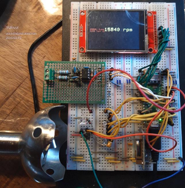 Thinking about this, I believe the speed of the spindle is controlled by the voltage (100V=20000 rpm) and if I can get a reliable read of the speed with the IR tachometer then I could just monitor the motor voltage and convert it to display RPM.