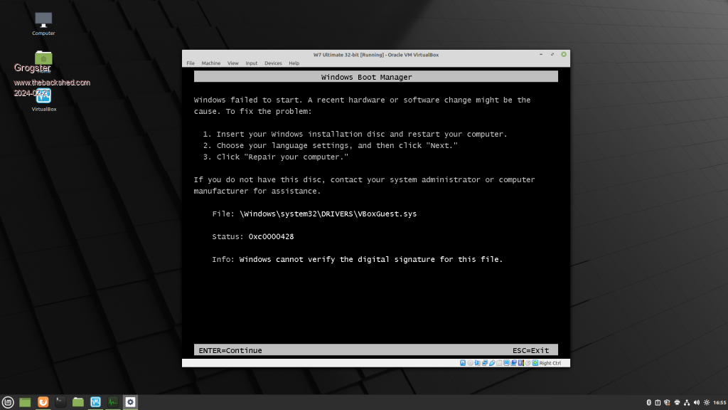 Yes, that is what I did. W7 then wanted to run the installer, so I let it. That completed fine. On reboot, it dies. I setup a brand-new copy of W7, and the very first thing I did, was insert that image and run the installer, and even on the completely clean install, it fell over a died and would no longer boot. This time, I grabbed a screenshot of the error: ![]() Oh, BTW....YES....I ticked "Trust software from Oracle" etc during the setup, so Windoze should not be bleating about this at all. I wonder if there is a bug in the latest version of the guest additions image? EDIT: Or perhaps the download of the ISO for the guest additions I have is corrupted or something? I do remember using the guest additions before years ago when I was last playing with VB, and I don't remember there being any problems. ![]() Edited 2024-02-21 15:27 by Grogster Smoke makes things work. When the smoke gets out, it stops! |