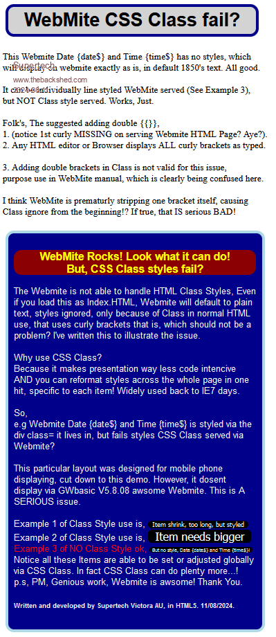 Thanks to replies. As PM states, two {{ and } using CSS in HTML DOES work. Not tried on external file CSS yet. However, kind of defeats purpose of using the HTML { and }. Why? 1. Any HTML editor that can show the live HTML page, dpes this, A. Cannot show CSS class styles etc as it cannot be displayed, resorting to what Webmite shows as raw text. The very opposite of why Webmite requires {{, thus is NOT HTML CSS compatible ,B. To then add/remove e.g {{ to { is a massive task, while C. Editor throws at you making mistakes if adding {{ not { it expects, and finally D. Even IF you try to add another { to single; HTML editor rightfully puts it as {{} not the extra {, thus you have to delete editor added } for EVERY CSS COMMAND YOU MAY HAPPEN TO BE USING! Sorry, NOT HTML CSS compatible. Total disaster. So unfortunately the {{ instead of { is, For above reasons highly impractical & Impossible to implement. Can another character be used instead? Say {. ? PM your thoughts please... |