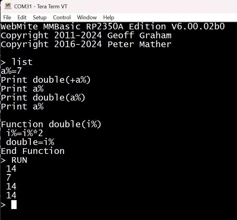 Error: Expression syntax Not on a PicoMite, works as expected hmmm. it truly is a bug - but just in the mx170 version! geoff? cheers, rob :-) > > a=7 > ?double(a) 14 > ?double(+7) 14 > ?double(+a) Error: Expression syntax > > ? mm.ver 5.0501 > Edited 2025-01-17 00:09 by robert.rozee |