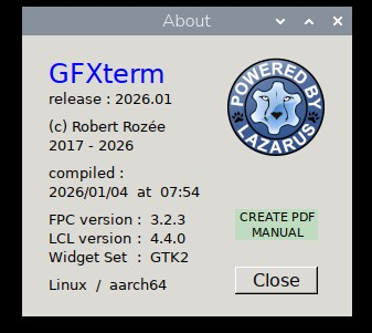 excellent from the right-click menu in GFXterm, if you select 'about' you should see a small window pop up containing some build information, are you by any chance able to post the result?cheers, rob :-) |