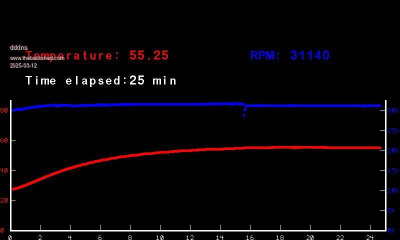 After a runtime of around 18min at 31.000 RpM the temperature rise stopped and kept being further on at 55,5°C. That is more than satisfying as it can run permanently at 32.000!