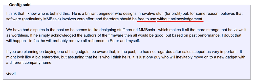 Geoffg said  I think that I know who is behind this.  He is a brilliant engineer who designs innovative stuff (for profit) but, for some reason, believes that software (particularly MMBasic) involves zero effort and therefore should be free to use without acknowledgement.