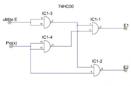 Gday Jim, You could use a 74HC00 as shown and get what you want with one chip. and use one uMite pin (low for E1 and High for E2, just before you issue the LCD command)