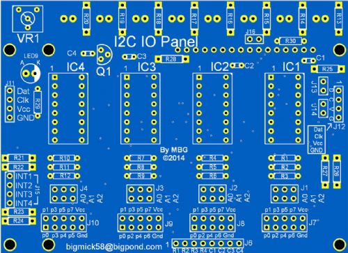 The IO-Panel is driven via I2C (5v power due to the LCD) and utilises 4 individual I2C IO-Expanders, each one can be addressed between 20H and 27H via jumpers. The IO-Panel is designed to mount on the back of either a 20x4 LCD module or 16x4 LCD Module.