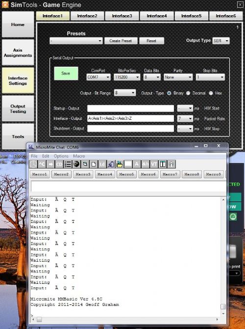 Hi Halldave, The output is binary and your sample program works perfectly, needed minor adjustments on the X,Y,Z format.. Input ranges from 0 to 255.. These are the values required for setting the motors directions further on in the program.. DO ' read 1 character dat$=INPUT$(1,#1) if dat$ = "A" then ' Start of Record datout$="" endif if dat$="Z" then ' End of Record x=asc(left$(datout$,1)) y=asc(mid$(datout$,2,1)) z=asc(right$(datout$,1)) print x, y, z endif if dat$<>"A" and dat$<>"Z" then datout$=datout$+dat$ endif LOOP Thank you all for such fast response, I can now continue with the rest |