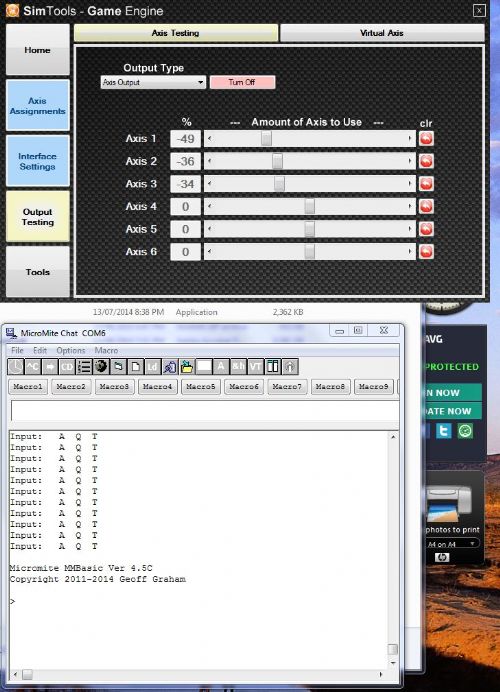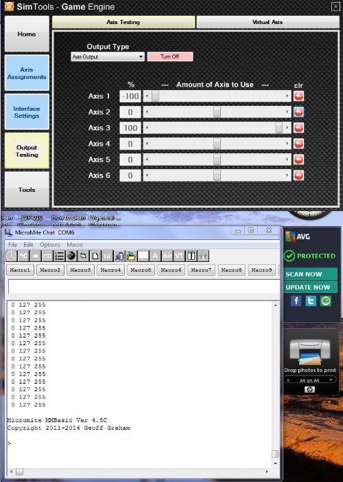 Hi all, Just discovered the MicroMite and this forum. I am interested in programming the MicroMite to be able to drive 3 DC motors for a simulation program chair. I have written the program below which allows me to interact with the Simulation Engine with as many Axis as specified in the interface setting, in this case made up as follows: [A<Axis1><Axis2><Axis3>Z] The [A] marks the start and the [Z] the end of the transmission. PROGRAM: ............................. CPU 48 OPEN "COM1:115200: inv" AS #1 DIM dat AS STRING DO DO WHILE INPUT$(1,#1)<>"A" PRINT "Waiting" LOOP dat$ = "" DO x$= INPUT$(1,#1) IF x$ = "Z" THEN PRINT "Input: " + dat$ EXIT Do ELSE dat$ = dat$ + " " + x$ ENDIF LOOP dat$ = "" LOOP ............................... There are some delayed occurring between the transmission but these are not so relevant during the simulation. Biggest problem is that I cannot relate the input values to any specific coding.. These values change when the Axis Testing Sliders are used. Can anyone suggest where or what I do incorrect so that possible to receive a whole number instead of these different ASCII codes and extensions.. Thanks |