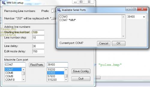 Open MMEdit2.inf (in the data folder up from the program folder) and down the bottom of the file is a [Serial] section