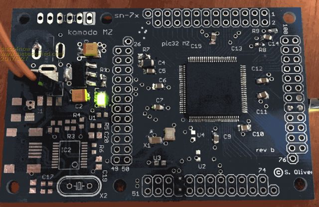 Fair and rational comments, no worries ! The oscillator listed in the component list matches the pads well, and solders OK. I agree it is small, and a larger one would assist things. http://au.element14.com/abracon/asdmb-24-000mhz-lc-t/mems-osc-24mhz-2-5-x-2mm-lvcmos/dp/2467879 (ed) The ICSP pins work for reflashing with a pickit3 as usual. For the next iteration, I will drop the 2200 option and bring the three 1455 programming lines to a three-pin header just below it. That will allow people (that do not have a pickit3) to use a little 3-wire jump cable to be used when/if reflashing is required, and prevent incidental reflashing access when it is not intended. |