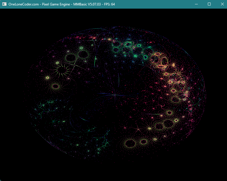 Bubble Universe for PicoMiteVGA @252MHz color optimization added a little speed MODE 2 FRAMEBUFFER LAYER FRAMEBUFFER WRITE L RX=MM.HRes:RY=MM.VRes:CX=RX\2:CY=RY\2 r=(2*Pi)/25:x=0:v=0:t=0:SC=RY\4 Dim integer CV(15) For i=0 To 15: Read CV(i): Next i Data &H000000,&H0000FF,&H004000,&H0040FF Data &H008000,&H0080FF,&H00FF00,&H00FFFF Data &HFF0000,&HFF00FF,&HFF4000,&HFF40FF Data &HFF8000,&HFF80FF,&HFFFF00,&HFFFFFF Do :CLS :c=1  For i=50 To 80 Step 2   For j=50 To 100 Step 1    u=Sin(i+v)+Sin(r*i+x)    v=Cos(i+v)+Cos(r*i+x)    x=u+t    Pixel CX+u*SC,CY+v*SC   Next j   Inc c: If c>15 Then c=1   Colour CV(c)  Next i Inc t,.025 FRAMEBUFFER COPY L,N,B Loop Edited 2024-01-16 04:44 by javavi |