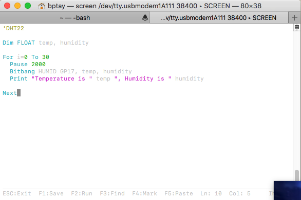 If memory serves to get correct readings a DHT22 should only be read at 2 second intervals. When it receives a "wake" pulse it retrieves the last readings from memory and sends them then takes new readings, saves them and goes to sleep and won't accept another "wake" pulse for 1.8 seconds. BITBANG HUMID returns 1000 if it does not get a response, or the checksum is wrong. Edit Just tested a DHT11 on b10 and BITBANG HUMID works perfectly with 2 S intervals and alternates with 1000 with 1 S intervals. Edited 2023-01-27 22:16 by phil99 |