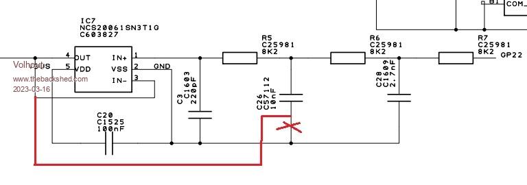 Peter, C22 and C26 should connect to the opamp outputs, not to ground. Volhout PicomiteVGA PETSCII ROBOTS |