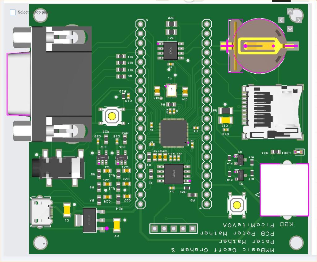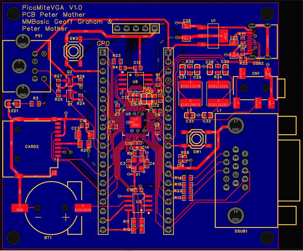 I have designed a ground up PicoMiteVGA including 16Mbyte Flash, DS1321 RTC, Volhout's high spec audio filter, micro-SD, PS2 etc. This doesn't use the Pico but is built from the RP2040. Every component used is available in quantity from JLC and the price above includes them soldering everything. i.e. for a complete ready-to-run board I have included a Pico footprint so you could add any of the Pico format modules (e.g. GPS) Unlike the Pico all pins are broken out. The majority of the price is in the "non-standard" components - the RTC itself is GBP3 and then things like the SDcard slot, PS2 connector, VGA connector all add to the price but, of course, this is true for a board you build yourself. If this seems interesting I will get a couple of board made to find and fix any errors. I love the JLC visualisation software - you can even see the through hole pins sticking through the board The board is 75x67mm double sided so cheap as chips but uses small components so I wouldn't recommend hand soldering Schematic FYI PicoMiteVGA - Project.pdf ![]() ![]() ![]() ![]() Edited 2023-03-16 05:01 by matherp |