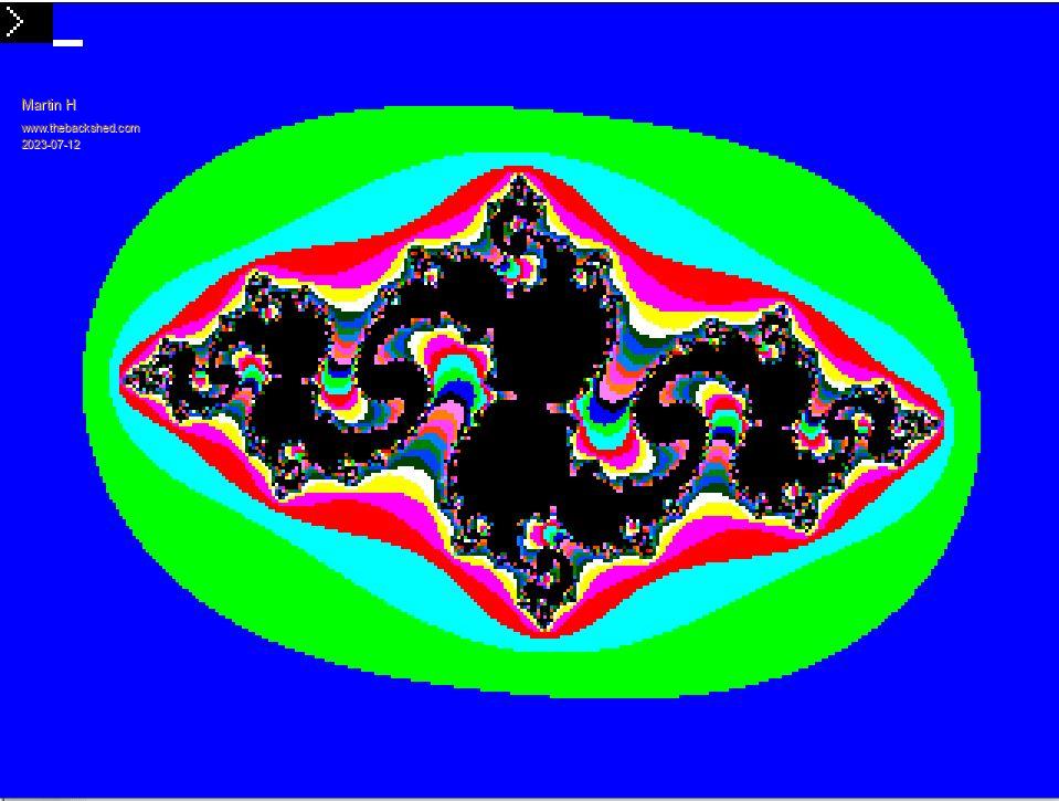 Even with just 16 Colors you are able to draw colorfull pictures with small Code 'MMBASIC (PicoMiteVGA) translated from Qbasic Source: 'https://rosettacode.org/wiki/Julia_set#QBasic escala = 1 / 81:zeroX = 160:zeroY = 120 maxiter = 32 CR = -.798 CI = .1618 dim integer CL(15) Restore COLORS:for y=1 to 15:read CL(y):next mode 2 FOR x = 0 TO 2 * zeroX - 1 FOR y = 0 TO 2 * zeroY - 1 zreal = (x - zeroX) * escala zimag = (zeroY - y) * escala FOR iter = 1 TO maxiter BR = CR + zreal * zreal - zimag * zimag zimag = CI + 2 * zreal * zimag zreal = BR IF zreal * zreal + zimag * zimag > 4 THEN Pixel x, y, cl((iter MOD 16)) EXIT FOR END IF NEXT NEXT NEXT END colors: '--Colorscheme accordung to matherp Data RGB(BLUE),RGB(GREEN),RGB(CYAN),RGB(RED) Data RGB(MAGENTA),RGB(YELLOW),RGB(WHITE),RGB(MYRTLE) Data RGB(COBALT) ,RGB(MIDGREEN),RGB(CERULEAN),RGB(RUST) Data RGB(FUCHSIA),RGB(BROWN),RGB(LILAC) 'no comment |