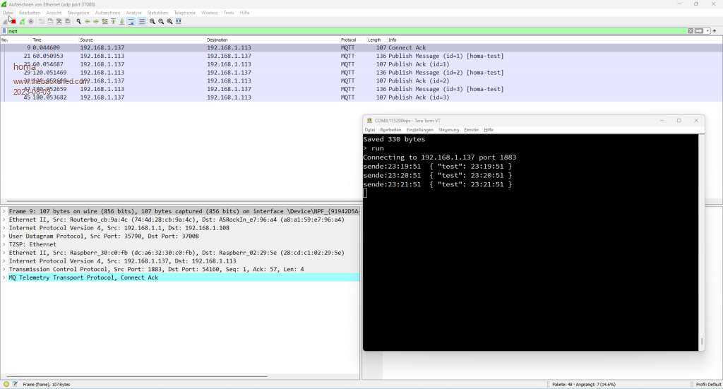 Unfortunately I don't see this in Wireshark! My little test programme: WEB mqtt close WEB mqtt connect "192.168.1.137", 1883, "mqtt", "*******" SetTick 60000,mymqtt Dim test$ ' Do Loop ' Sub mymqtt test$=Time$ Print "sende:";test$, value$="{ "+Chr$(34)+"test"+Chr$(34)+": "+test$+" }" WEB mqtt publish "homa-test",value$ Print value$ End Sub At 60 seconds, everything looks good ... ![]() I don't see a keep-alive signal after 180 seconds ... Instead, the system tells me that the connection has been closed. ![]() Edited 2023-08-03 07:41 by homa |