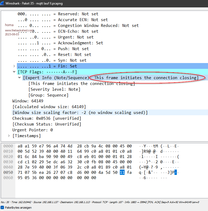 Hi Peter, The MQTT broker (https://mosquitto.org/ ) i use supports PINGREQ. Is it possible that this is a BUG in WebMite? I have reduced the test program again. 1) connect to MQTT server 2) after 10 seconds a MQTT message 3) wait! and after about 150 seconds the PINGREQ/PINGRESP TCP messages? * 4) after another 10 seconds the next MQTT message. But instead the message "mqtt_publish: TCP disconnected" AND no TCP messages in WireShark!!!! Maybe the bug is that a status is set incorrectly in MMbasic and the interpreter does not realise that it is still allowed to send? Where else would the error message come from? Can you please check this in the source code? Thanks a lot! Matthias *Addendum: I just see that after the 150 seconds the connection from the server (192.168.1.137) to the client (.113) is established! Is it possible that this is the disconnect message? (YES! see screenshot.) Then PINGREQ/PINGRESP would definitely be missing in beta10. (1) 1 0.000000 192.168.1.113 192.168.1.137 TCP 101 59941 → 1883 [FIN, ACK] Seq=1 Ack=1 Win=16376 Len=0 2 0.000000 192.168.1.113 192.168.1.137 TCP 101 [TCP Retransmission] 59941 → 1883 [FIN, ACK] Seq=1 Ack=1 Win=16376 Len=0 3 0.000618 192.168.1.137 192.168.1.113 TCP 107 1883 → 59941 [FIN, ACK] Seq=1 Ack=2 Win=64148 Len=0 4 0.000748 192.168.1.137 192.168.1.113 TCP 107 [TCP Retransmission] 1883 → 59941 [FIN, ACK] Seq=1 Ack=2 Win=64148 Len=0 5 0.002740 192.168.1.113 192.168.1.137 TCP 105 59942 → 1883 [SYN] Seq=0 Win=16384 Len=0 MSS=1460 6 0.003069 192.168.1.113 192.168.1.137 TCP 105 [TCP Retransmission] 59942 → 1883 [SYN] Seq=0 Win=16384 Len=0 MSS=1460 7 0.003293 192.168.1.137 192.168.1.113 TCP 107 1883 → 59942 [SYN, ACK] Seq=0 Ack=1 Win=64240 Len=0 MSS=1460 8 0.003440 192.168.1.137 192.168.1.113 TCP 107 [TCP Retransmission] 1883 → 59942 [SYN, ACK] Seq=0 Ack=1 Win=64240 Len=0 MSS=1460 9 0.009186 192.168.1.113 192.168.1.137 TCP 101 59941 → 1883 [ACK] Seq=2 Ack=2 Win=16375 Len=0 10 0.009546 192.168.1.113 192.168.1.137 TCP 101 [TCP Dup ACK 9#1] 59941 → 1883 [ACK] Seq=2 Ack=2 Win=16375 Len=0 11 0.009935 192.168.1.113 192.168.1.137 MQTT 157 Connect Command 12 0.010139 192.168.1.113 192.168.1.137 TCP 157 [TCP Retransmission] 59942 → 1883 [PSH, ACK] Seq=1 Ack=1 Win=16384 Len=56 13 0.010310 192.168.1.137 192.168.1.113 TCP 107 1883 → 59942 [ACK] Seq=1 Ack=57 Win=64184 Len=0 14 0.010439 192.168.1.137 192.168.1.113 TCP 107 [TCP Dup ACK 13#1] 1883 → 59942 [ACK] Seq=1 Ack=57 Win=64184 Len=0 15 0.010960 192.168.1.137 192.168.1.113 MQTT 107 Connect Ack 16 0.011126 192.168.1.137 192.168.1.113 TCP 107 [TCP Retransmission] 1883 → 59942 [PSH, ACK] Seq=1 Ack=57 Win=64184 Len=4 17 0.237845 192.168.1.137 192.168.1.113 TCP 107 [TCP Retransmission] 1883 → 59942 [PSH, ACK] Seq=1 Ack=57 Win=64184 Len=4 18 0.237845 192.168.1.137 192.168.1.113 TCP 107 [TCP Retransmission] 1883 → 59942 [PSH, ACK] Seq=1 Ack=57 Win=64184 Len=4 19 0.239745 192.168.1.113 192.168.1.137 TCP 101 59942 → 1883 [ACK] Seq=57 Ack=5 Win=16380 Len=0 20 0.239745 192.168.1.113 192.168.1.137 TCP 101 [TCP Dup ACK 19#1] 59942 → 1883 [ACK] Seq=57 Ack=5 Win=16380 Len=0 (2) 21 10.016971 192.168.1.113 192.168.1.137 MQTT 136 Publish Message (id=1) [homa-test] 22 10.017126 192.168.1.113 192.168.1.137 TCP 136 [TCP Retransmission] 59942 → 1883 [PSH, ACK] Seq=57 Ack=5 Win=16380 Len=35 23 10.020780 192.168.1.137 192.168.1.113 MQTT 107 Publish Ack (id=1) 24 10.020944 192.168.1.137 192.168.1.113 TCP 107 [TCP Retransmission] 1883 → 59942 [PSH, ACK] Seq=5 Ack=92 Win=64149 Len=4 25 10.258225 192.168.1.113 192.168.1.137 TCP 101 59942 → 1883 [ACK] Seq=92 Ack=9 Win=16376 Len=0 26 10.258369 192.168.1.113 192.168.1.137 TCP 101 [TCP Dup ACK 25#1] 59942 → 1883 [ACK] Seq=92 Ack=9 Win=16376 Len=0 (3) 35 162.010442 192.168.1.137 192.168.1.113 TCP 107 1883 → 59942 [FIN, ACK] Seq=9 Ack=92 Win=64149 Len=0 36 162.010644 192.168.1.137 192.168.1.113 TCP 107 [TCP Retransmission] 1883 → 59942 [FIN, ACK] Seq=9 Ack=92 Win=64149 Len=0 37 162.012541 192.168.1.113 192.168.1.137 TCP 101 59942 → 1883 [FIN, ACK] Seq=92 Ack=10 Win=16375 Len=0 38 162.012616 192.168.1.113 192.168.1.137 TCP 101 [TCP Retransmission] 59942 → 1883 [FIN, ACK] Seq=92 Ack=10 Win=16375 Len=0 39 162.012839 192.168.1.137 192.168.1.113 TCP 107 1883 → 59942 [ACK] Seq=10 Ack=93 Win=64148 Len=0 40 162.013073 192.168.1.137 192.168.1.113 TCP 107 [TCP Dup ACK 39#1] 1883 → 59942 [ACK] Seq=10 Ack=93 Win=64148 Len=0 (4) ??? > run Connecting to 192.168.1.137 port 1883 <== (1) .......... sende:12:47:49 { "test": 12:47:49 } <== (2) ...................................................................................................................................... ..........................................................................................<== (3) ...... sende:12:51:39 mqtt_publish: TCP disconnected{ "test": 12:51:39 } <== (4 - nothing!) ................. > ![]() Edited 2023-08-03 22:27 by homa |