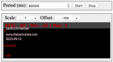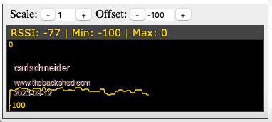 Carl, still no better luck for me with your latest WiFiScanner 2.zip. It lists correctly RSSI in the console, but nothing happens on the 192.168.32.13/graphrssi.html. > files A:/ <DIR> . <DIR> .. 09:53 13-09-2023 6272 .DS_Store 09:54 13-09-2023 128 404.html 09:54 13-09-2023 128 all 09:54 13-09-2023 128 apple-touch-icon.png 00:00 01-01-2000 4 bootcount 09:54 13-09-2023 4608 favicon.ico 09:54 13-09-2023 2432 graphrssi.html 09:54 13-09-2023 3968 graphs.js 09:55 13-09-2023 128 JSONHeader.txt 09:55 13-09-2023 128 log.txt 09:55 13-09-2023 6528 WiFiScannerv1_0.bas 2 directories, 11 files, 503808 bytes free This is all in the log.txt after 6 RSSI measurements (RSSI -68...-71): 13-09-2023,09:59:49, 2 Fred |