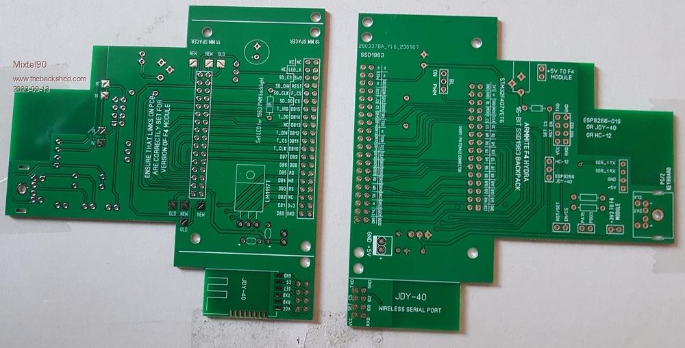 As mentioned in another thread, I've been sorting out a "backpack" that allows a Armmite F4 to be mounted behind a SSD1963 without losing access to the IO pins. The prototype boards have just arrived! ![]() Just some connectors to arrive then it'll be playtime. :) The JDY-40 is an adapter board that is cut off. Also, two lines indicate where to cut the board to fit it behind a 4.3 inch display. I have some ides for a version 2, but nothing in the pipeline yet. . Edited 2023-09-13 18:38 by Mixtel90 Mick Zilog Inside! nascom.info for Nascom & Gemini Preliminary MMBasic docs & my PCB designs |