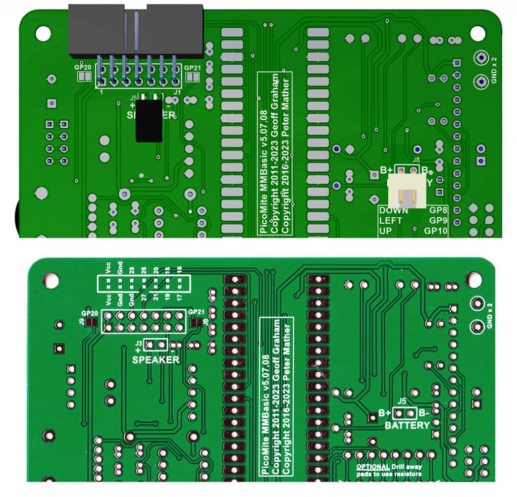 Thanks folks. That would be great .It is wired for touch, but I don't imagine I will make use of that in games. I included it because I had the GPIO free and I thought that being of a relatively portable form-factor any spare PCBs might have use in future projects, e.g. a handheld version of your logic-analyser. That is also why: - The 8 pins used by the controller switches are also available via J10. - I didn't use the analog pins and made them and a couple of other free GPIO available via J1. - I made provision for not attaching the audio pins GP20 & 21 so they could also be made available via J1. Best wishes, Tom Edited 2023-09-17 08:30 by thwill MMBasic for Linux, Game*Mite, CMM2 Welcome Tape, Creaky old text adventures |