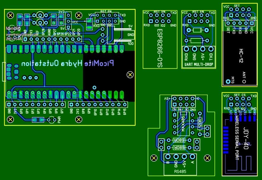 Recently I've done a couple of LCD display adapters with the name "Hydra". They can use an optional serial comm board to control remote IO. This is an extension of the idea, using the same little comm boards fitting the same ESP9266-01S connector. This design is for a remote IO outstation on the end of a serial link, however the type of link is up to the user - the main board is the same. Four PicoMite pins are reserved, all the rest are available.