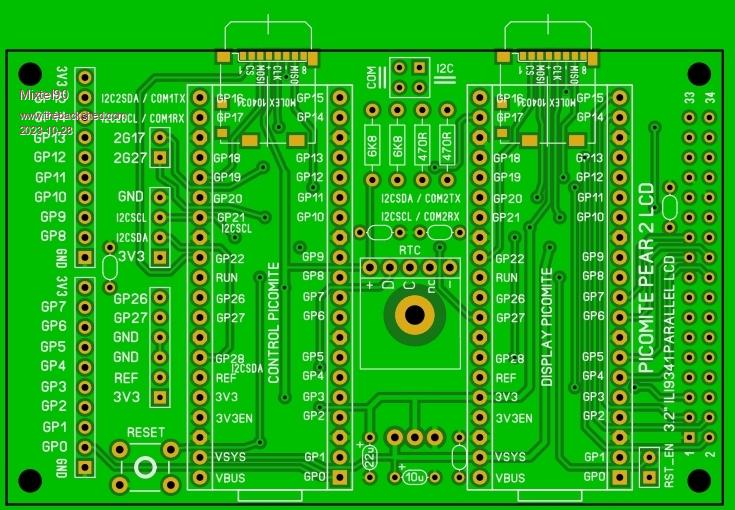 This one started in one direction and ended somewhere else. :) I was designing another backpack, but this time for the 3/2" ILI9341 parallel LCD display that Peter has used for his high performance game board. It got virtually to the release point then I thought "what if..." and everything went crazy. :) The original PicoMite Pear design used a PicoMite VGA for the display driver. This time it's an ordinary PicoMite but with the parallel LCD display. The control PicoMite has just about everything brought out. Two pins are used for communication between the PicoMites. They can be configured for either a COM port or I2C. Additionally two pins from the Display PicoMite are available. the idea is that these could be used for RTS/CTS or an interrupt system to get a fast data connection. Each PicoMite can have its own microSD card if required. A link is provided to isolate the display Picomite's Reset line so that only the control device gets reset. A single linear regulator powers everything except the display, which is fed at 5V. There's no real reason for other than it makes having a common supply easier than when using the SMPS. Power is from either of the two USB sockets as VSYS is connected in parallel. It might be of interest to anyone who fancies letting one Pico be an intelligent display handler controlled by signals from the controller. Mick Zilog Inside! nascom.info for Nascom & Gemini Preliminary MMBasic docs & my PCB designs |