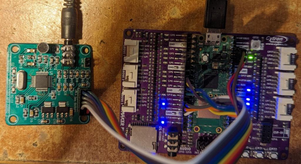 Just a few lines of code Option escape Option explicit Option default none ' create the request for the radio site (ClassicFM) Dim a$="ice-the.musicradio.com" Dim q$="GET " Inc q$,"/ClassicFMMP3" Inc q$," HTTP/1.1\r\n" Inc q$,"Host: " Inc q$,a$ Inc q$,"\r\nConnection: close\r\n\r\n" 'create a circular buffer for reading the internet stream and 'read and write pointers Dim buff%(4095),w%,r% ' Configure the VS1053 and tell it to play from the circular buffer Play vs1053 GP9, gp8, gp7, gp6, buff%(), r%, w% ' Open the internet radio site WEB open tcp stream a$,80 ' Send the request to start the stream using the circular buffer specified WEB TCP CLIENT STREAM q$, buff%(), r%, w% 'sit back and listen Do Pause 500 Loop Hardware requirement 1 PicoW 1 VS1053 9 Dupont connection cables Software requirement Peter and Geoff's magic WebMite MMBasic V5.07.08RC15 WebMiteV5.07.08RC15.zip ![]() Edited 2023-11-10 05:38 by matherp |