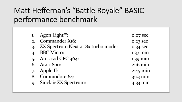 Well, I am a silly sausage. I've been looking at the how the CMM2 stacks up to the current competition. The Agon Light makes a big deal as to how fast it's basic is, and they publish a table on their website showing it compared to other computers using Matt Heffernan's Mandelbrot benchmark.