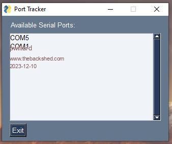 A simple python script can keep track of active ports... #------------------------------------------------------------------------------- # Name: # Purpose: Simple tracker for active serial ports attached to windows PC # # Author: Pete Willard # # Created: 15/08/2023 # Copyright: (c) willard 2023 # Licence: CC BY-NC-SA #------------------------------------------------------------------------------- import serial.tools.list_ports import time import PySimpleGUI as sg def main(): layout = [ [sg.Text("Available Serial Ports:")], [sg.Listbox(values=[], size=(40, 10), key="-PORTS-")], [sg.Button("Exit")] ] window = sg.Window("Port Tracker", layout) while True: event, values = window.read(timeout=1000) # Auto-update every 1000 milliseconds if event == sg.WINDOW_CLOSED or event == "Exit": break refresh_ports(window) window.close() def refresh_ports(window): ports = [port.device for port in serial.tools.list_ports.comports()] window["-PORTS-"].update(values=ports) if __name__ == "__main__": main() Could be modified to show Device ID, if you really wanted it I suppose. |