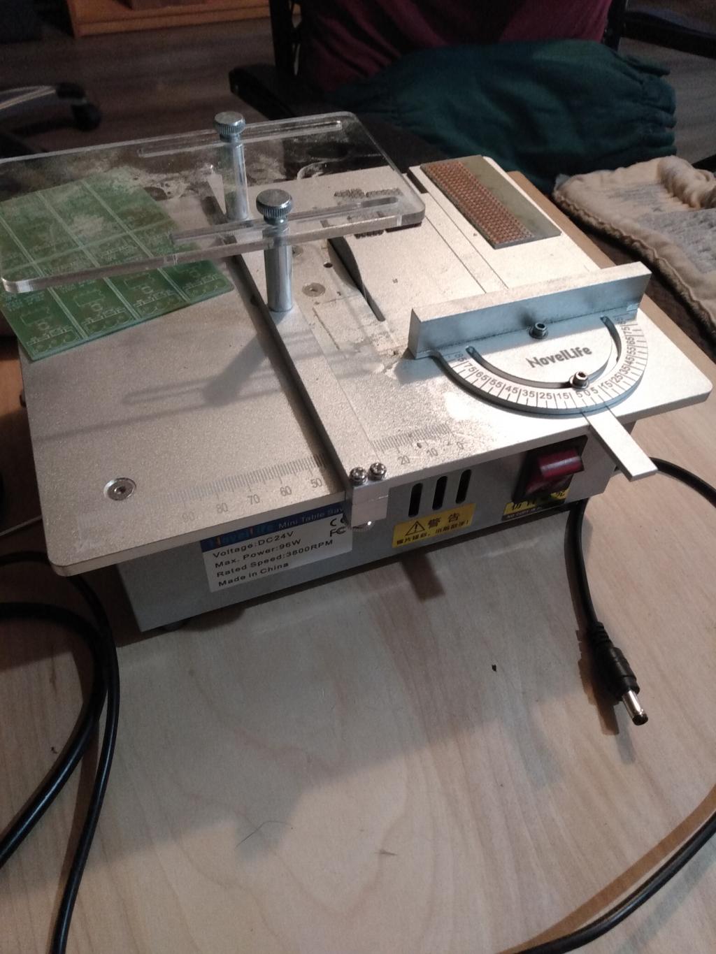 I've been trying to find a satisfactory way to do PCB grooving myself. also cutting "extra" boards off a big one or putting several small boards onto one 100x100 to save money. Putting a board in the vice, scoring it and bending it until it breaks is fine, but it makes a right mess of the edges. I've just got a "Mini Table Saw" from AE and added a diamond blade: ![]() ![]() It's tiny, as you can see, but it's a "proper" saw and seems to work well. I've tested it cutting a board and also grooving one and the results aren't bad. It's a bit fiddly setting the fence up - it's rather crude. Construction is very good. The main box is painted steel and the top plate is a hard aluminium grade, I think. The saw is mounted on a variable height bearing and a bracket off that holds the motor, which drives the saw via a double o-ring drive (some have a belt). The belt tension is adjustable. A 7-speed power supply is provided. Luckily it has a standard IEC inlet as the supplied mains lead isn't UK. There are several versions of this on AE, superficially the same but they differ appreciably sometimes. Most importantly, this version has a variable height blade and there is a box beneath the blade that collects most of the dust. Not all are laid out like this. I paid about £30 + tax for the saw (it's a very basic model) and about £6 + tax for a bag of 4 assorted blades (including a spare for the fine woodcutting one that comes with it). You can also get a TCT blade which might be better for cutting FR4. Mick Zilog Inside! nascom.info for Nascom & Gemini Preliminary MMBasic docs & my PCB designs |