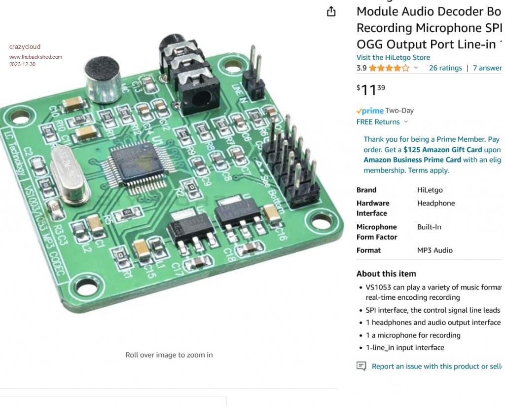 the exact midi board I used is this one https://www.amazon.com/HiLetgo-Recording-Microphone-Interface-12-288Mhz/dp/B07XCN3C7B/ref=sr_1_1_sspa?crid=P0892AAMM16X&keywords=vs1053+mp3+module&qid=1703882019&sprefix=vs1053%2Caps%2C288&sr=8-1-spons&sp_csd=d2lkZ2V0TmFtZT1zcF9hdGY&psc=1 ![]() don't connect the output to anything with a ground. I blew up my first board! I have the out put connected to a cheap audio transformer this one https://www.amazon.com/dp/B09KGXSJ12?psc=1&ref=ppx_yo2ov_dt_b_product_details I'll try the other program now. The input is much appreciated. |