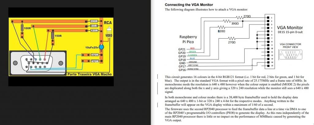 What you've shown in the RH circuit is how the PicoMite VGA hardware works to connect the Pico to a VGA monitor. I think the LH diagram is how to get a combined video signal into a VGA monitor. Did you mean AVI or AV, which is the combined video signal? AVI is a method of packaging video files. It has nothing to do with the hardware. To watch an AVI file you need a specific codec - a piece of software running on the Pico - to unpack the file and send it out on the hardware interface. I don't think the Pico could manage that. Mick Zilog Inside! nascom.info for Nascom & Gemini Preliminary MMBasic docs & my PCB designs |