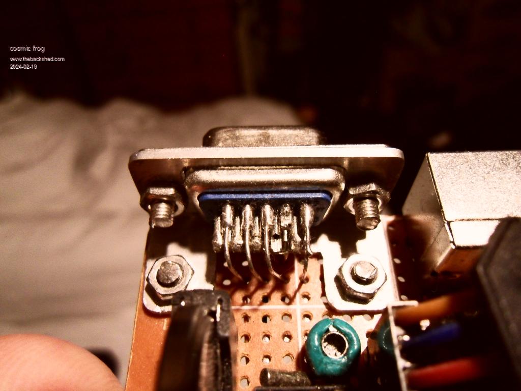 I quite like this idea, I wonder if header pins could be fitted to the VGA sockets top and bottom row and a header socket (female) could then be fitted to the Vero board, that way the "slot" would not be needed as the VGA socket would be raised above the board. Maybe? The ground pin would still be a problem though. Dave. Edited 2024-02-21 03:03 by cosmic frog |