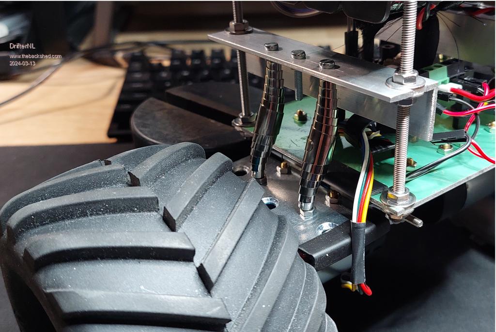 The suspension is made from 2 door hinges with the pins replaced with brass tube to take out a lot of the slop, metal pcb standoffs and springs that are normally used in garden tools.