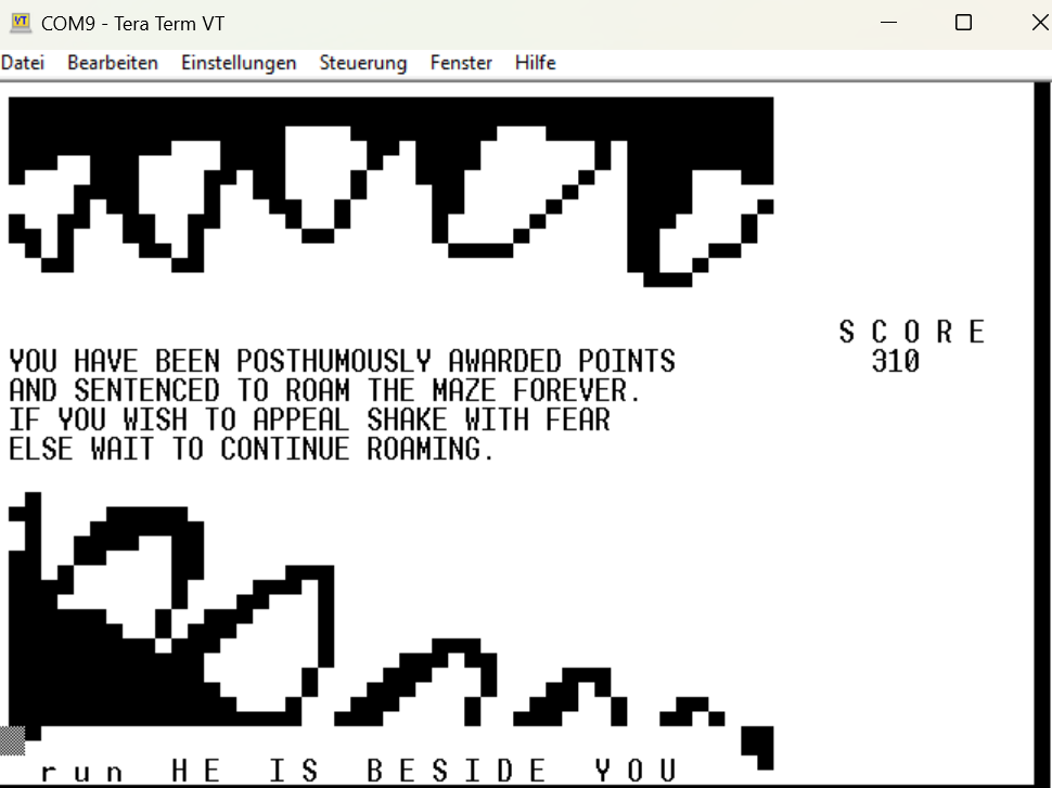 Yes I reached the exit of the maze. But it is difficult (as it was on the ZX 81 too) and it runs faster than the original. Rex runs only half as fast as you do, but of course you have to react immediately. Is there a strategy? For orientation: You always start at the bottom right, facing left, the exit is in one of the top 6 rows. You might extend the Pause 250-(Timer -tt%) in the main loop to give you more chances. Cheers Martin PS: Another tip: If the program stops with an error, you have the problem that the terminal no longer shows you a cursor,Since this was switched off for a better game impression. That makes editing really difficult. Simply type CURON to make the cursor flash again. Edited 2024-04-12 04:59 by Martin H. 'no comment |