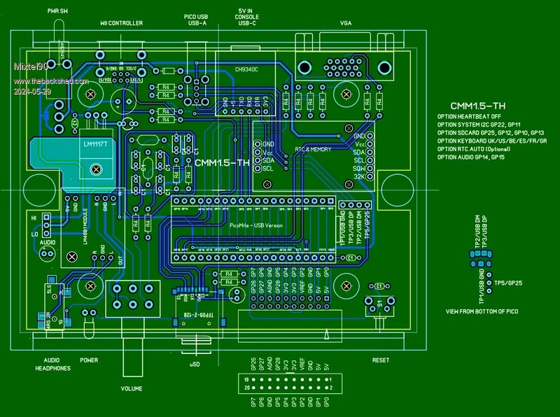 Inspired by Peter's CMM1.5, and fitting into the same case. I was wondering yesterday if it would be possible to fit a normal through-hole version in. This is what I came up with. The design isn't complete yet, it's not ready for building as without a case I can't be certain about the fit. The available drawing for that case is pretty poor. Peter used some of the normally reserved pins, which was a bit of a challenge. I've used GP25 as the SD card CS line so there's no heartbeat signal. I've connected the Pico's USB to a USB-A socket on the rear panel. That means taking the top off for installing the firmware at first - but you need to to get at the Boot button anyway. I decided that as half the GPIO connector would be rarely used I could halve it's length. I also reverted it to the original pattern on the first version of the CMM1.5 as that's the correct way up for those connectors. I don't care what you can get JLCPCB to use. :) Of course, there's no GP29, but I connected the same pin. If a modified YD-RP2040 is used then it should be possible to get GP29 back. I left out the power amp and replaced it with a LM4881 high quality headphone amp. This uses a common ground for the outputs. I added an option to power it from 5V (about 200mW max output) or 3V3 (about 90mW max output). Min. impedance is 8R so it will drive small speakers. Mick Zilog Inside! nascom.info for Nascom & Gemini Preliminary MMBasic docs & my PCB designs |
