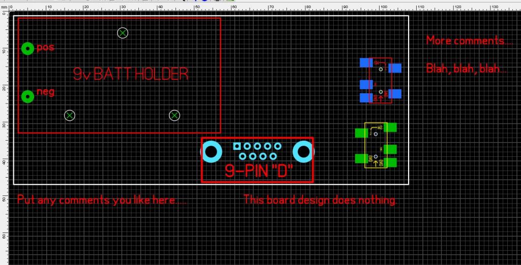 Thanks Grogster, I'll check that out. :) Yep, comments are fine outside the outline, they simply crop the board there. Everything inside the outline goes through the DRC and goes on the gerbers though. That means that any comments there have to be on a silkscreen or the outline layer and you have to delete them (not just switch them off) when you get the board made. You can't leave comments there for next time you want to look at the board. Mick Zilog Inside! nascom.info for Nascom & Gemini Preliminary MMBasic docs & my PCB designs |