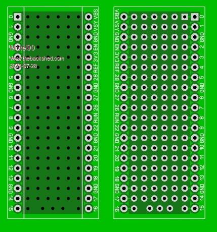 Mixtel90 your good at whipping out boards real quick. How about an experimenter board using female long pin headers and an array of pads give 2 connected pads for 1 header and 1 for hookup use. LOOKING AT TOP VBUS o-o o o o o o-o GP0 VSYS o-o o o o o o-o GP1 GND o-o o o o o o-o GND 3EN o-o o o o o o-o GP3 VREF o-o o o o o o-o GP4 GP28 o-o o o o o o-o GP5 ~~~~~~~~~~~~~~~ GND o-o o o o o o-o GND GP17 o-o o o o o o-o GP14 GP16 o-o o o o o o-o GP15 could also be used on the pico for DIY use making things smaller. Just random thoughts tonight LOL Quazee137 Edited 2024-07-28 17:08 by Quazee137 |
