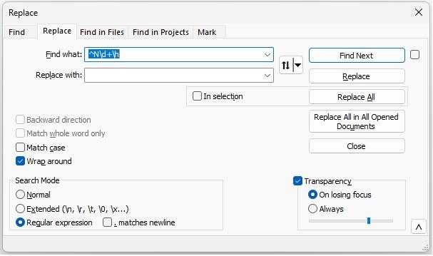 OK just learnt something today.... Open the .dnc file in Notepad++ In main menu select Search, Replace In the popup box put ^N\d+\h into the Find what box. Leave the Replace with box empty. In Search Mode select the Regular Expression button. Click the Replace All button. All line numbers will be removed. Apparently ^ means start of line N is literal \d means digits + means match the preceding atom one or more times \h means horizontal spaces |
