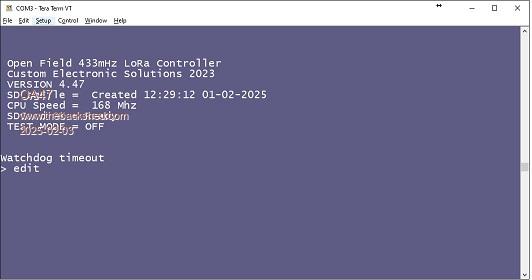 I managed to scroll through the TeraTerm screens and found the screen info for the error the other day. ![]() But I have had the program wiped twice since then around 12 hours apart with just the watchdog notification. ![]() Im a bit lost here. OA47 |