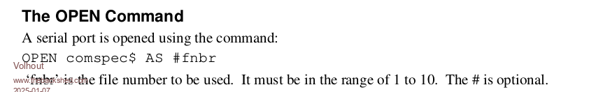 Thanks for all the replies. I was trying to use the INPUT command rather than writing my own input processor, but I'll take a look at that code. As for the description of the INPUT behavior, that's what I was expecting, but not what I'm seeing. The keyboard on the terminal connected to the COM port does not respond. I make sure the terminal window is active and type, but nothing echos on the screen and pressing ENTER doesn't do anything. I re-wrote the program to using INKEY$ in a loop, exiting as soon as something is received and as soon as I press a key, it responds, so I am sure that the COM port is working for both send and receive. The reason I use a variable (_fileno%) for the file number is so that I can make one change (changing the value of _fileno%) to direct the output and input to the USB console or the COM port console. When I run the program using the USB console (_fileno% 0) INPUT behaves as expected. I did try hardcoding the file number in the INPUT statement (INPUT #5, X$), but that didn't work either. AFAIK, I am using identical parameters for both instances of the terminal programs (one for USB, one for COM). I just tried the same MMBASIC program using two instances of PuTTY running on Windows 10. I see the same thing, INPUT works on the USB terminal, not on the COM terminal. I've also tried two different terminal programs on the Mac (screen and minicom), no joy. When opening a file in MMBASIC, you have to specify whether the file is input, output or both. I don't see a similar option when opening a COM port. Do you need to tell MMBASIC that the COM port is used for both input and output? Thanks, Mark |