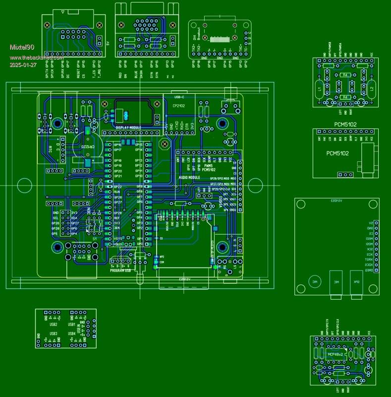 One HDMI video connector should be made on the main board, and the other two optionally on additional boards. Also, for the VGA video output, you can make a switching scheme for the VGA121/VGA222 palette (there are 8 lines involved anyway).There are many interesting retro emulator projects for this VGA222 circuit. I would also think about how to drag the Pico module to the edge of the board, thereby getting rid of the USB connector for programming and at the same time the heartbeat LED nearby. If you put the Pico module on the connector, there will be space under it for the USB Hub switch |