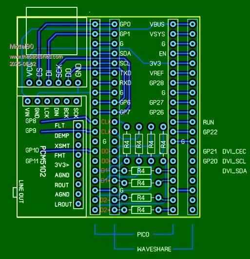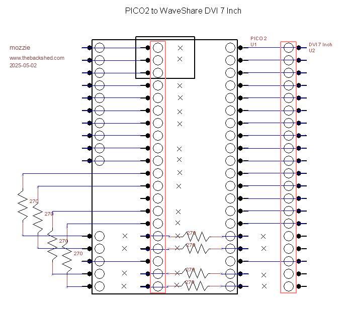 G'day, See below for... well... ummm... a diagram... You loose GP8,9,10,11 on the PICO side and GP16,17,18,19 on the DVI side using veroboard. These could be connected with jumpers of course with a bit of juggling. Use option HDMI PINS 1,3,6,4 if you do it this way. Also tested 720x400 and 848x480 resolution and can confirm they work as widescreen modes. Regards, Lyle. |